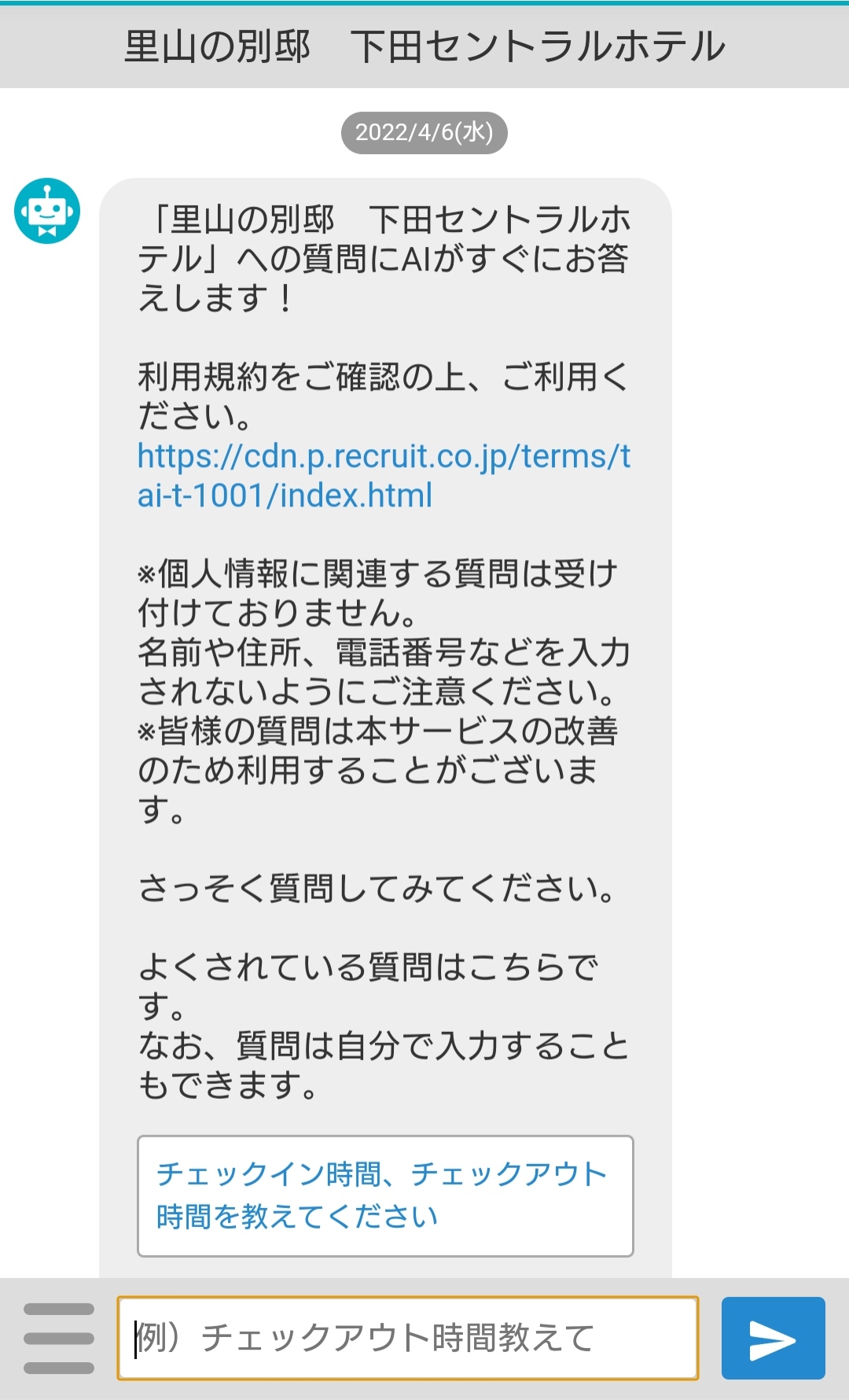 2022年4月4日(月)より、公式ホームページでは24時間いつでもAI(人工知能)コンシェルジュが自動でお客様のご質問をお受けできるようになりました。是非ご利用ください。