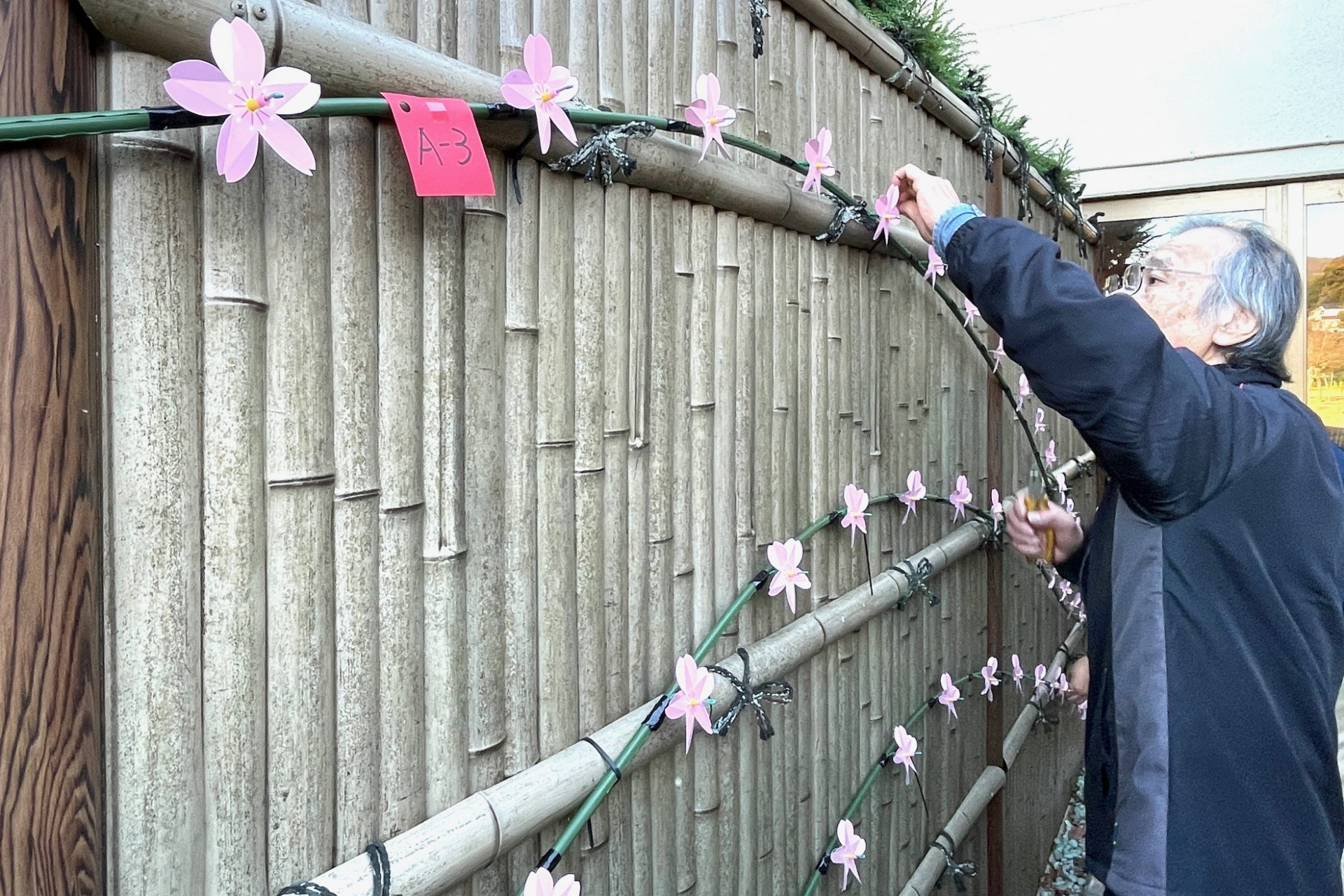 里山の風を受けてくるくると回る、桜の花を模した可愛らしい風車が、「花と緑とさくらの小径」に誘います。
