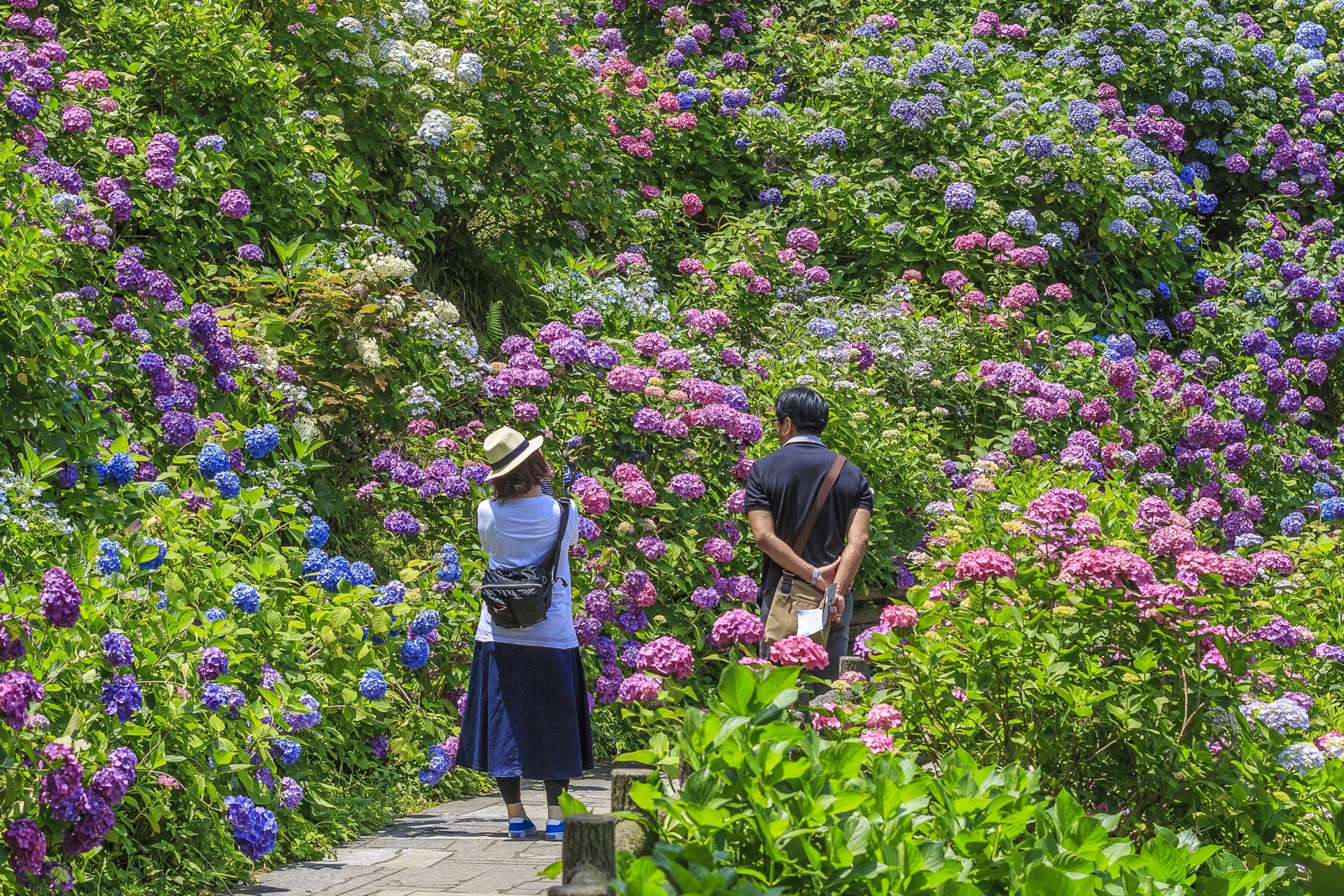 散策路では雨の雫をまとった色とりどりの紫陽花が