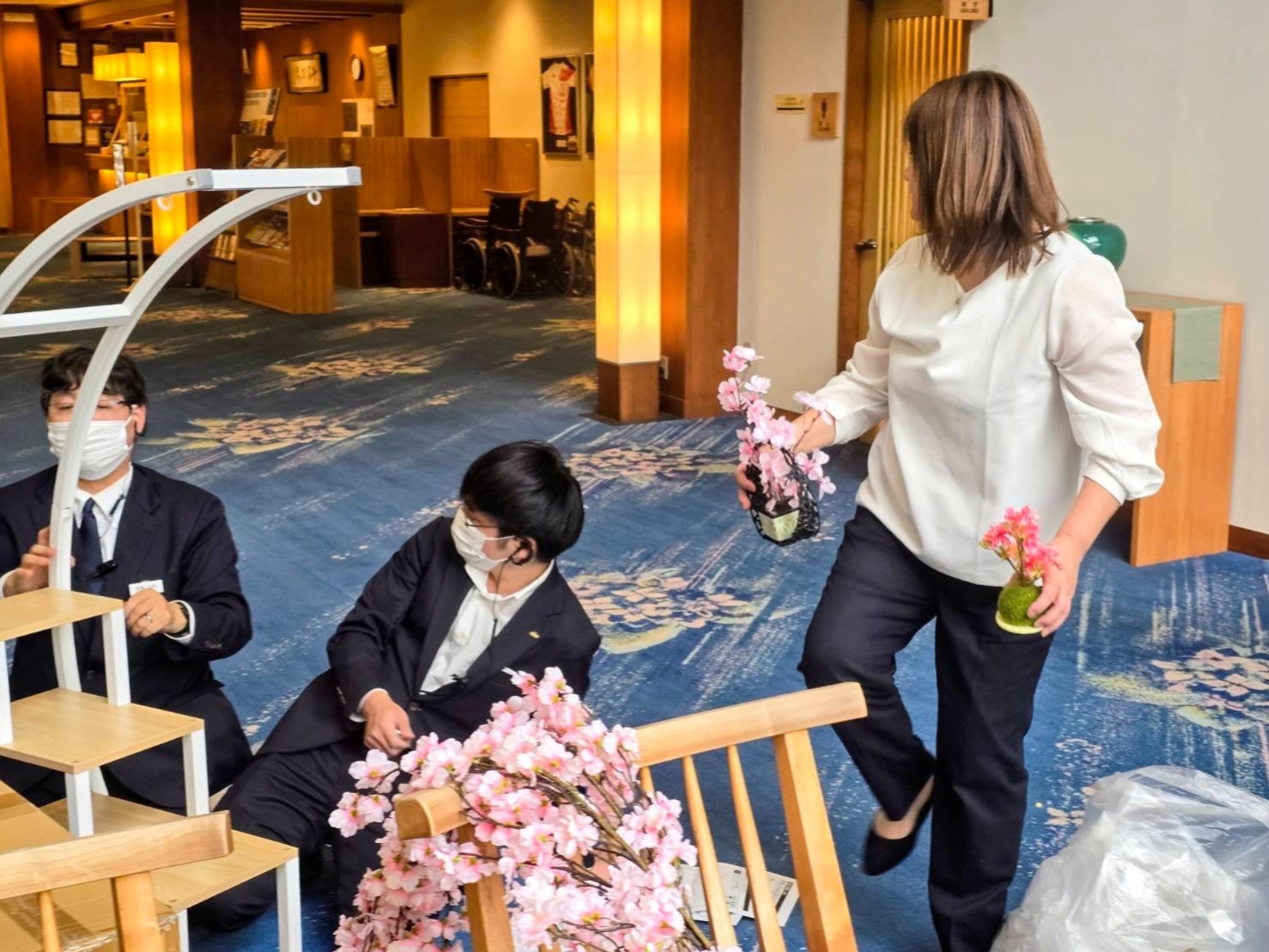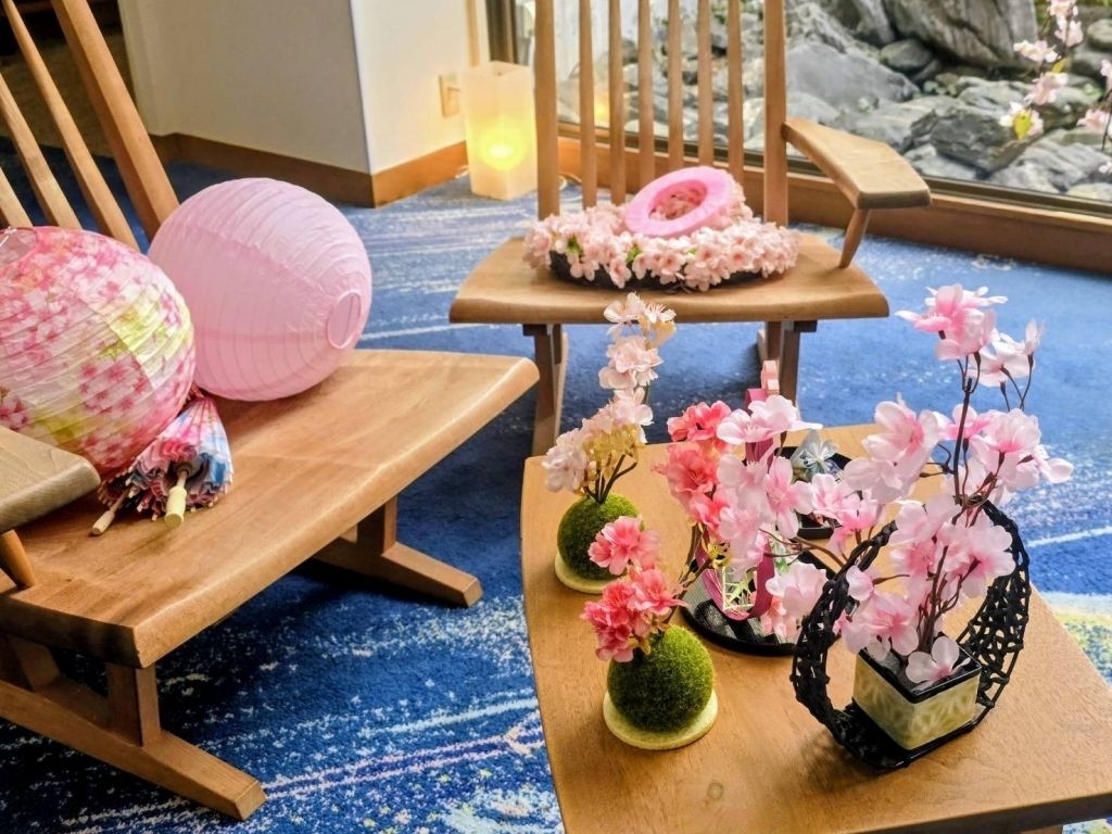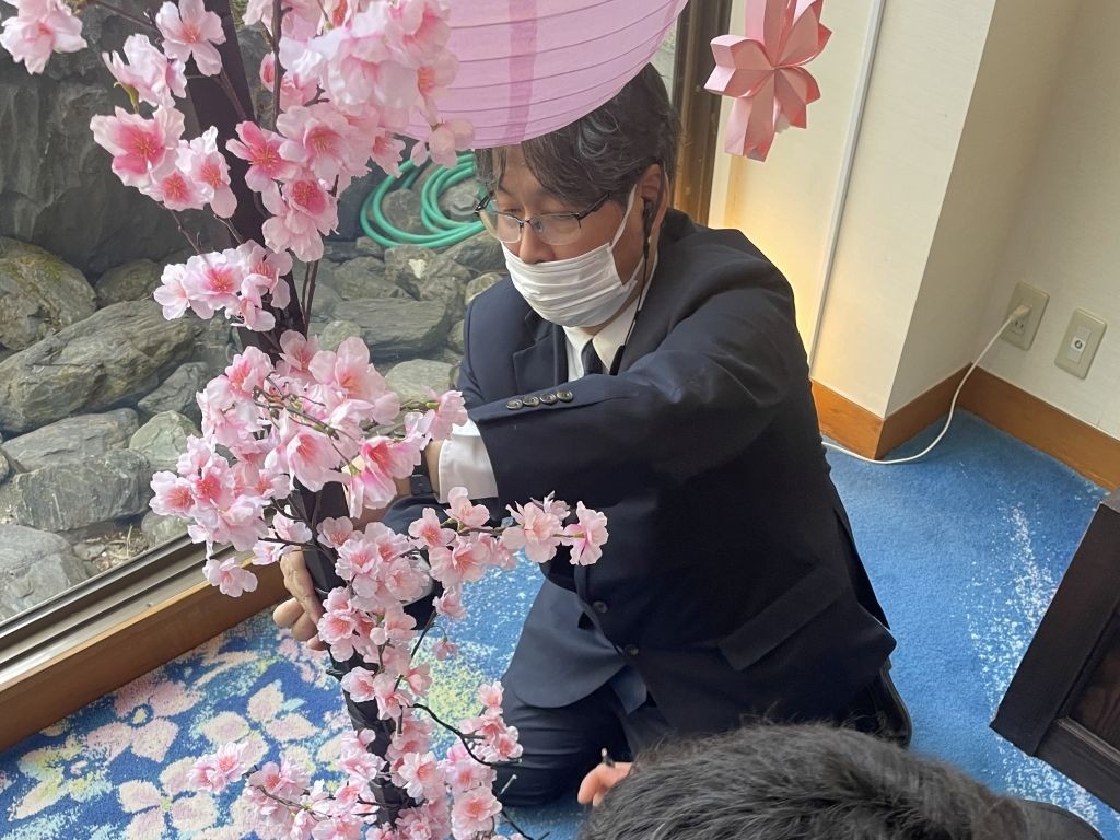 フロントスタッフ総出で、ロビーや大浴場に続く通路、中庭前に桜の演出を施しました。